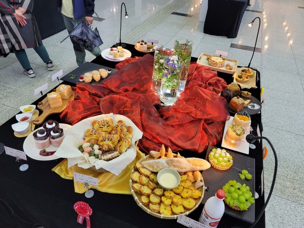 '건강한 빵 만들기 베이커리 경연대회'에서 입상한 학생들의 작품이 시청로비에 전시되어 있다.
