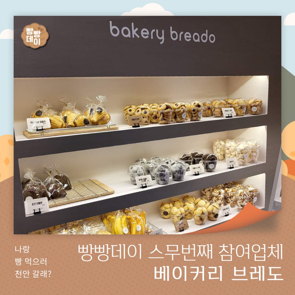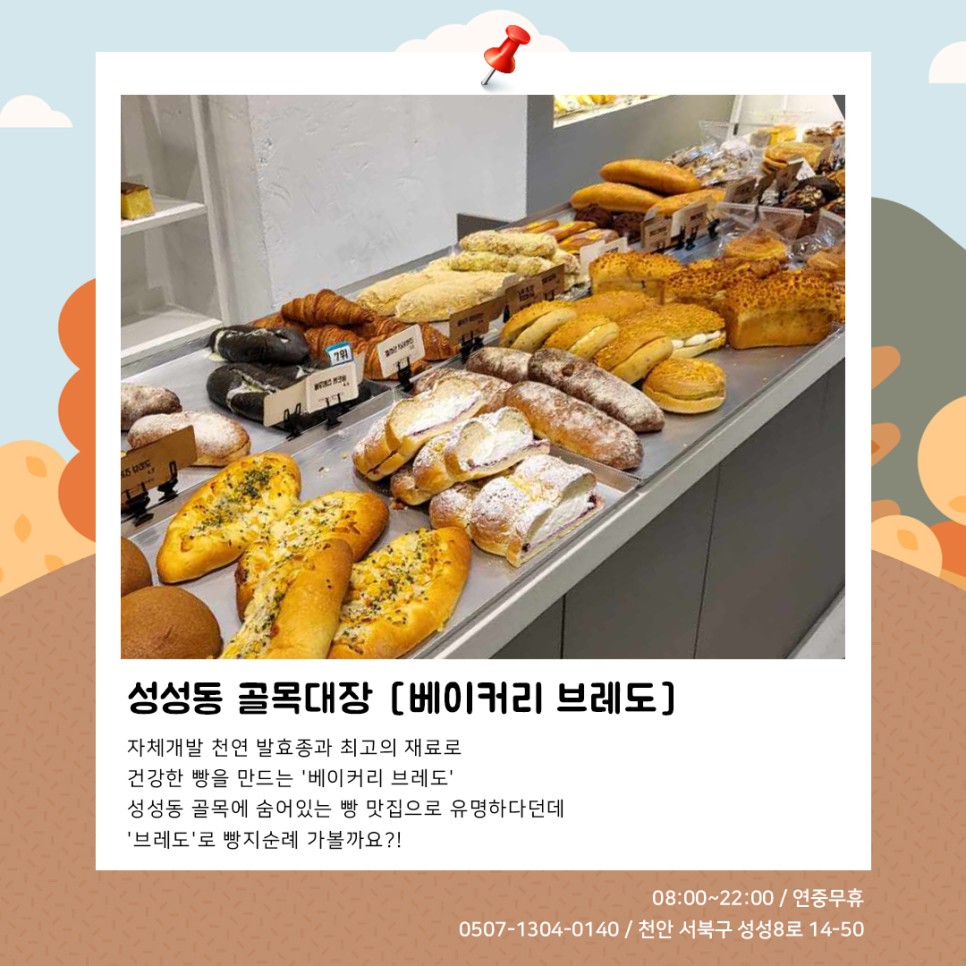 [천안 빵빵데이] 스무번째 참여업체 베이커리 브레도 최고관리자 0 천안 빵빵데이 스무번째 참여업체 베이커리 브레도성성동 골목에 숨어있는 빵 맛집베이커리 브레도에서는 자체개발 천연 발효종과 최고의 재료로건강한 빵을 만드는데 진심이랍니다맛이 궁금하시죠?!빵빵데이에서 베이커리 브레도를 만나보세요!베이커리 브레도천안 서북구 성성8로 14-50⏰08:00~20:00 (연중무휴)☎0507-1304-0140