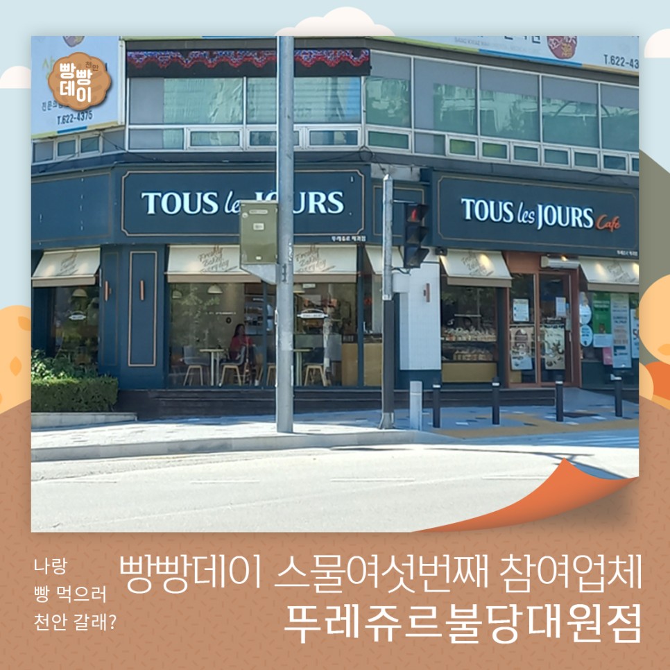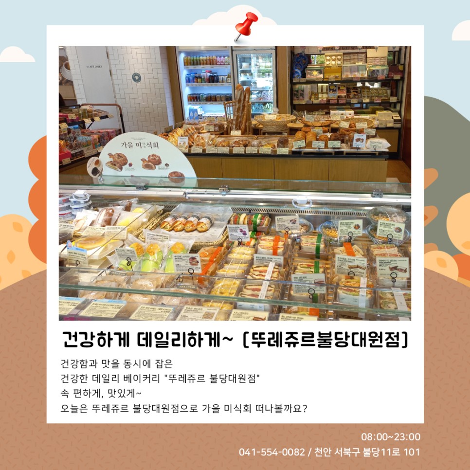[천안 빵빵데이] 스물여섯번째 참여업체 뚜레쥬르불당대원점 최고관리자 0 천안 빵빵데이 스물여섯번째 참여업체 뚜레쥬르불당대원점건강함과 맛을 동시에 잡은건강한 데일리 베이커리뚜레쥬르 불당대원점의 빵들은맛도 있으면서 속이 편하데요!❣오늘은 뚜레쥬르 불당대원점에서가을 미식회 떠나보는건 어떨까요?뚜레쥬르불당대원점천안 서북구 불당11로 101⏰08:00~23:00☎041-554-0082