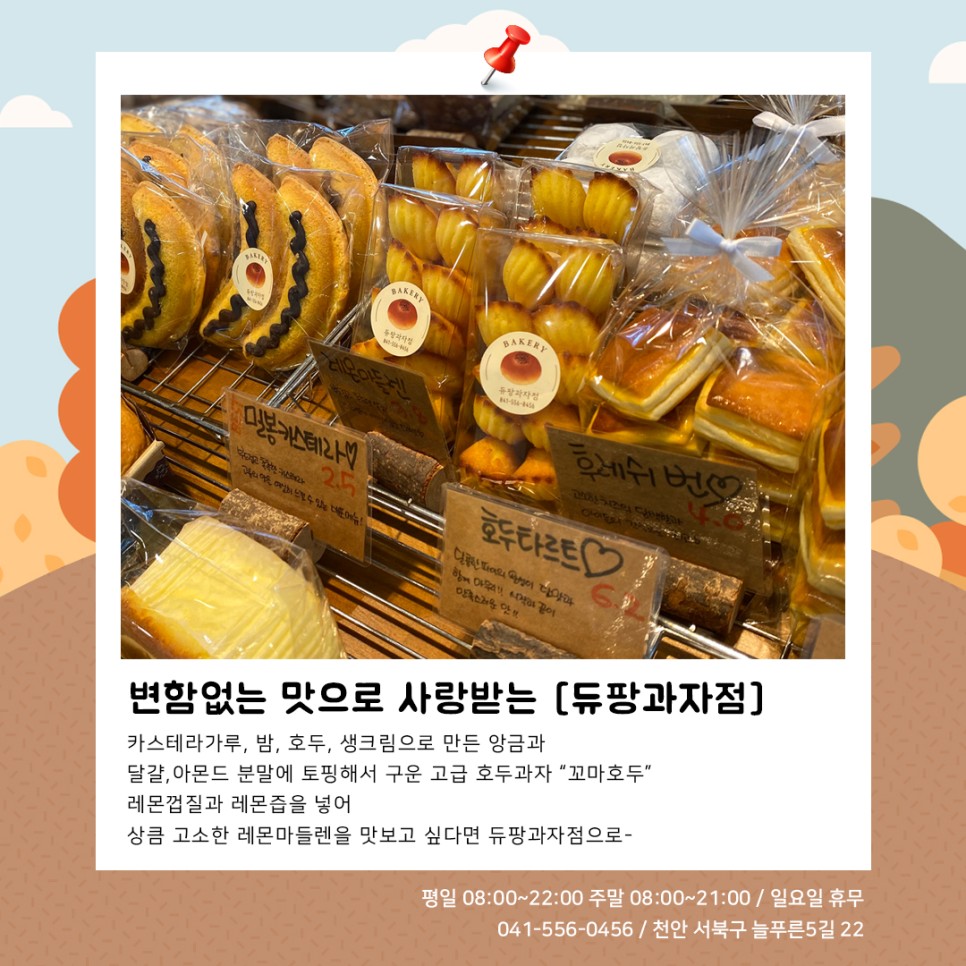 [천안 빵빵데이] 두번째 참여업체 듀팡과자점 최고관리자 0 천안 빵빵데이 두번째 참여업체 듀팡과자점카스테라가루, 밤, 호두, 생크림으로 만든 앙금과달걀,아몬드 분말에 토핑해서 구운 고급 호두과자 “꼬마호두”레몬껍질과 레몬즙을 넣어 상큼 고소한 "레몬마들렌"오늘날까지 변함없는 맛으로사랑받고 있는 듀팡과자점에서 만나봐요듀팡과자점천안 서북구 늘푸른5길 22⏰평일 08:00~22:00 / 주말 08:00~21:00(일요일 휴무)☎041-556-0456