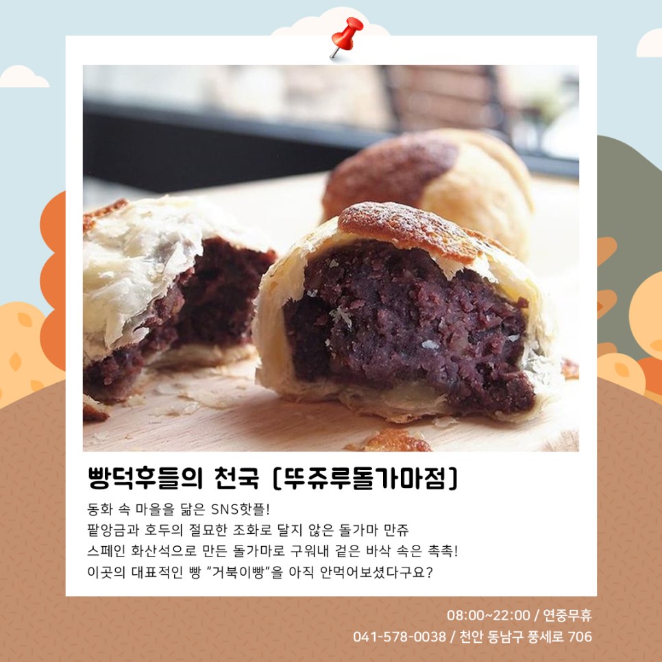 [천안 빵빵데이] 세번째 참여업체 뚜쥬루돌가마점 최고관리자 0 천안 빵빵데이 세번째 참여업체 뚜쥬루돌가마점동화 속 마을을 닮아포토존으로도 인기 있는 SNS핫플❗팥앙금과 호두의 절묘한 조화로 달지 않은 돌가마 만쥬와스페인 화산석으로 만든 돌가마로 구워낸겉.바.속.촉! 거북이빵이 대표적인데요아직 거북이빵을 안먹어보셨다구요?뚜쥬루돌가마점에서 바로 드셔보세요!뚜쥬루돌가마점천안 동남구 풍세로 706⏰08:00~22:00(연중무휴)☎041-578-0038