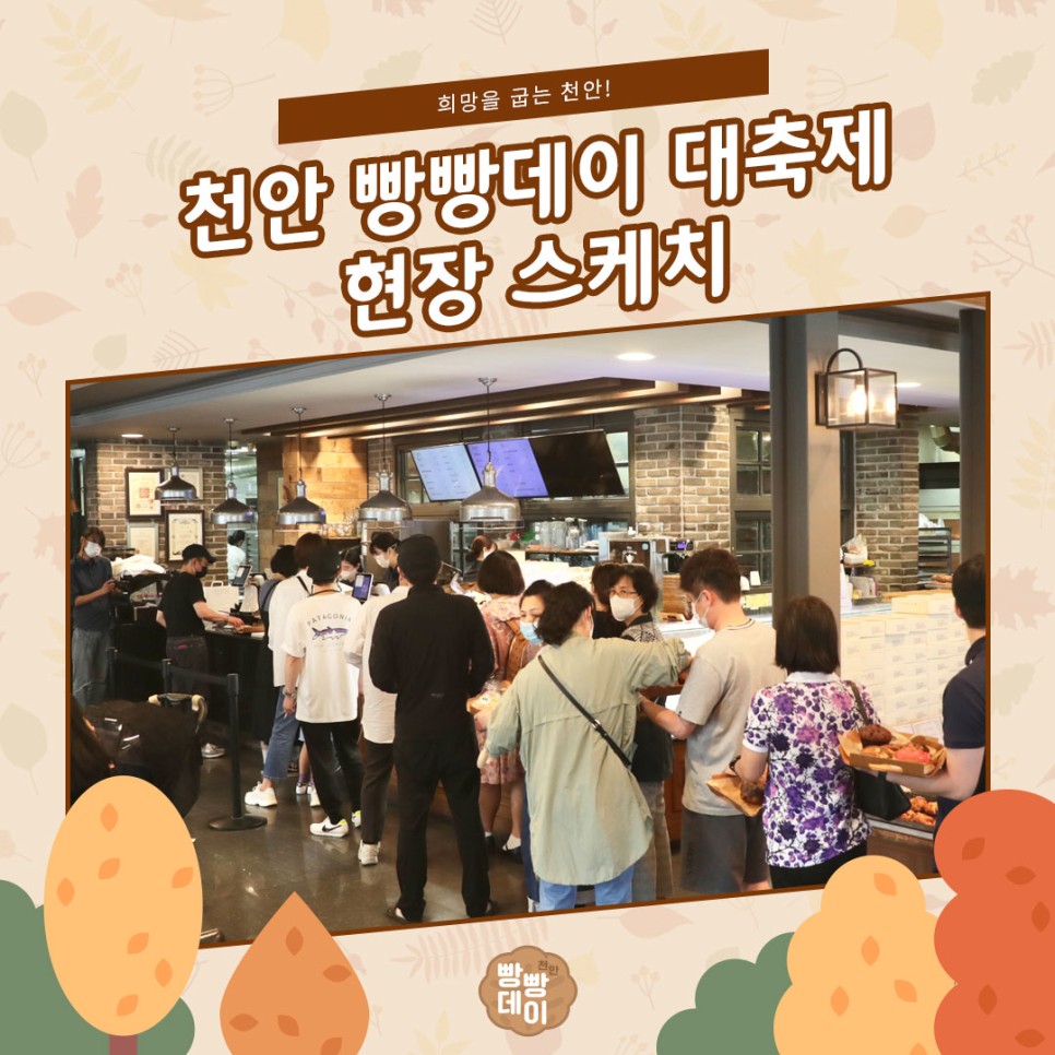 천안 빵빵데이 대축제 현장 스케치 최고관리자 0 천안 빵빵데이 대축제를 기억하시나요?2021년 10월 10일,많은 관심 속에서 성황리에 마무리 되었던빵빵데이 대축제의 순간들을 모아봤어요!◡̈ 그때 그 순간을 기억하며 우리 다시 한번,올해도 빵지순례 한번 가볼까요?!더욱 빵빵한 이벤트로 돌아올 2022천안빵빵데이많은 기대와 관심 부탁드립니다!2022 천안 빵빵데이 COMING SOON2022.10.9(일)~10.10(월)천안시청 버들광장