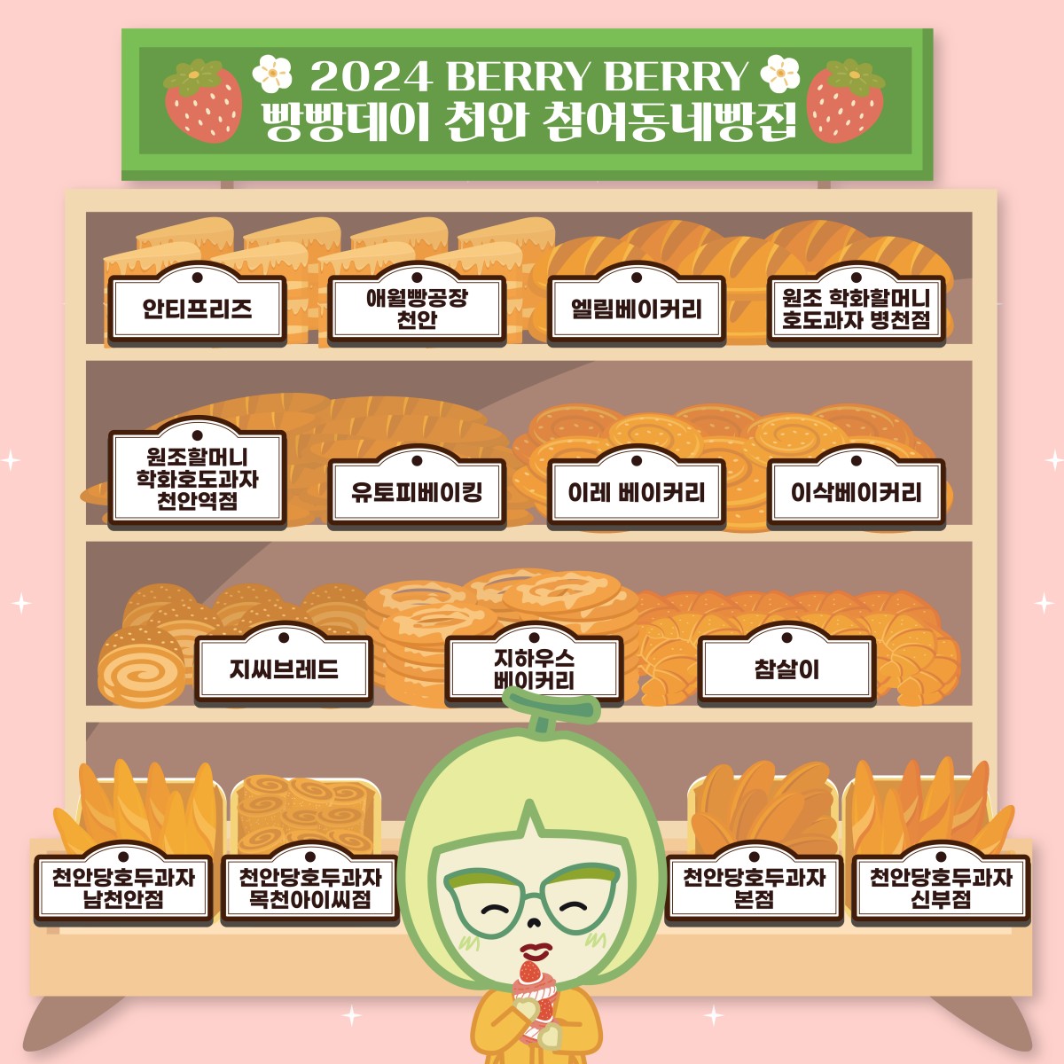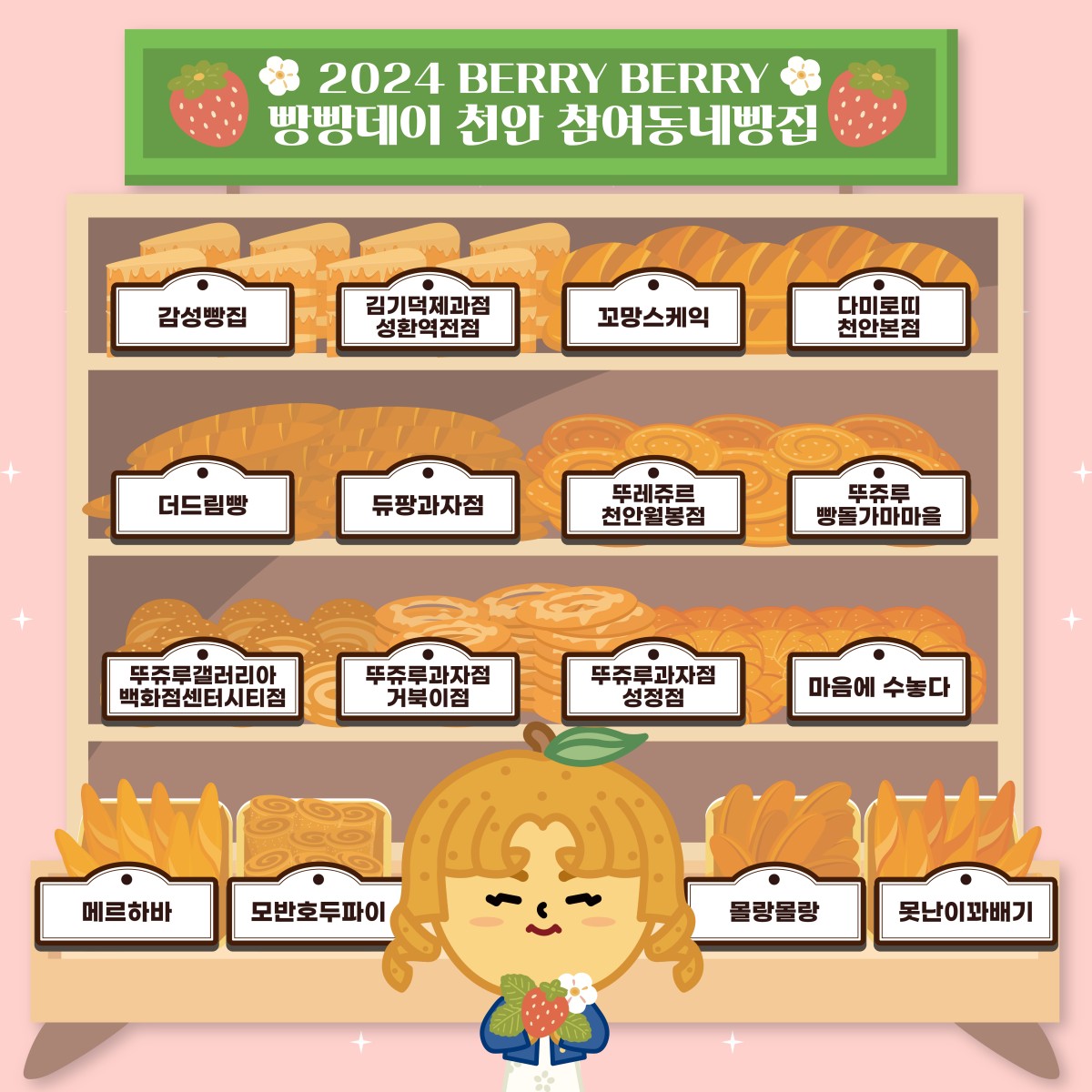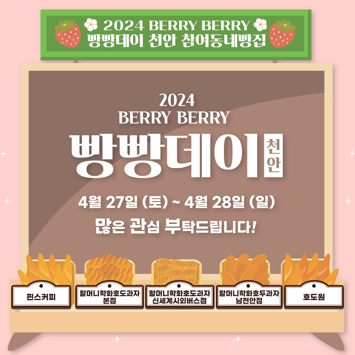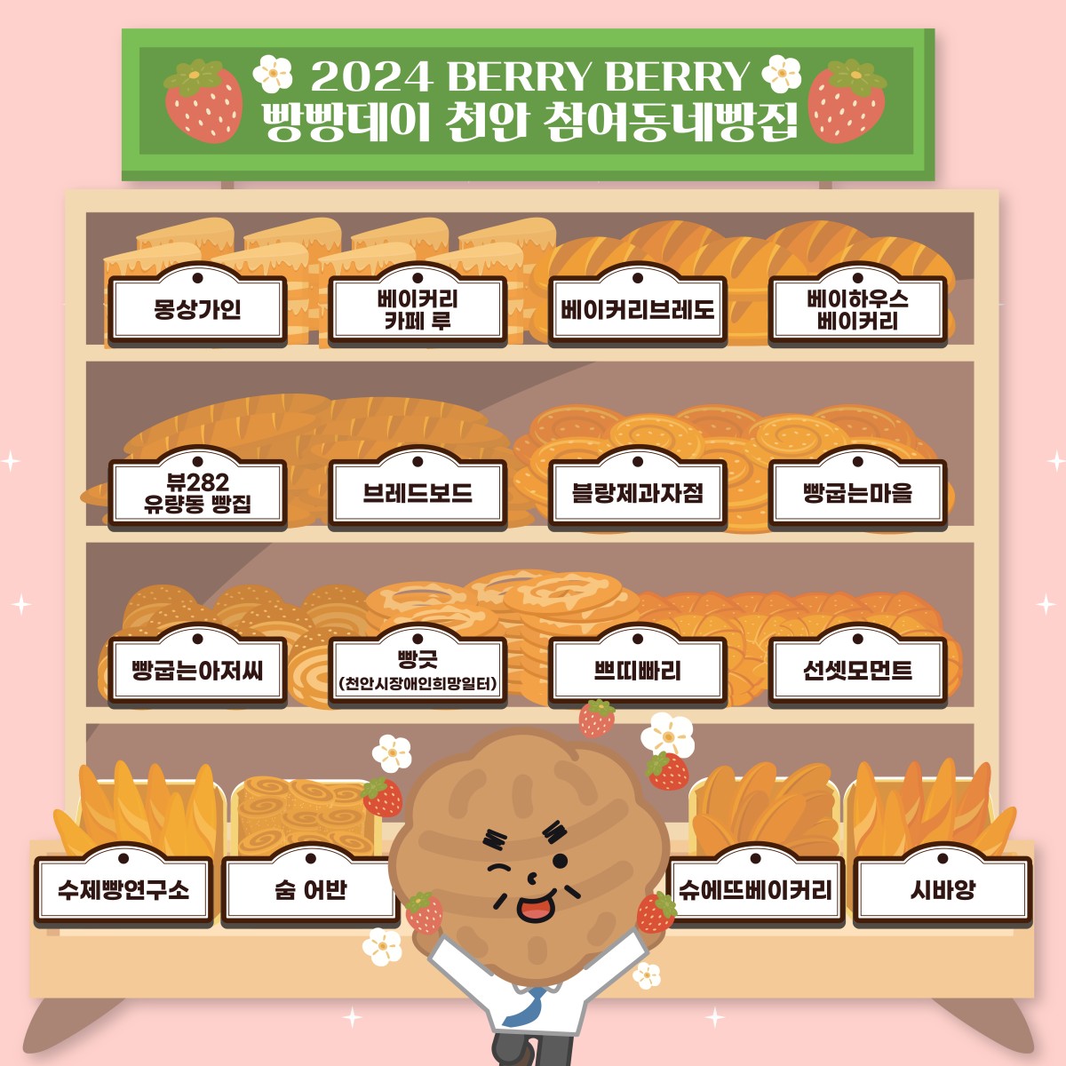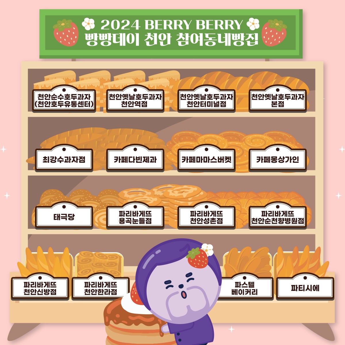[2024베리베리 빵빵데이 천안] 참여동네빵집 현황 최고관리자 0 2024.04.01 20:02 참여 동네빵집.pdf (195.5K) + 86 24년 4월 27일, 28일 이틀 동안 떠나는 빵지순례! 베리베리 빵빵하게 즐겨보세요! 참여동네빵집을 순례하며 베리베리 빵빵데이를 즐겨요~❤️