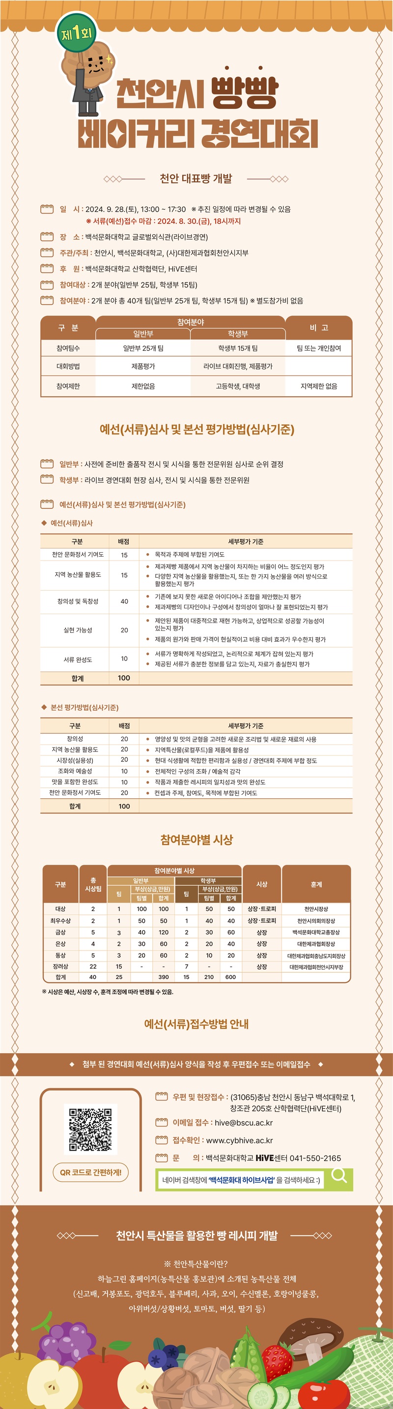 [천안시 빵빵 베이커리 경연대회] 참가자를 모집합니다 최고관리자 0 http://www.cybhive.ac.kr + 236 2024.08.20 14:17 팀명제1회 천안시 빵빵 베이커리 경연대회 예선서류심사 작성양식.hwpx (77.3K) + 23 ◎ 문의: 백석문화대학교 HIVE센터 041-550-2165