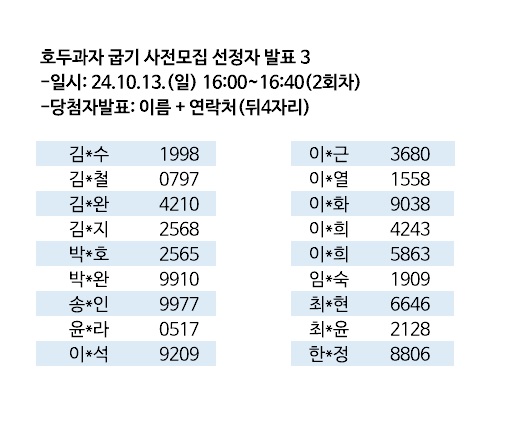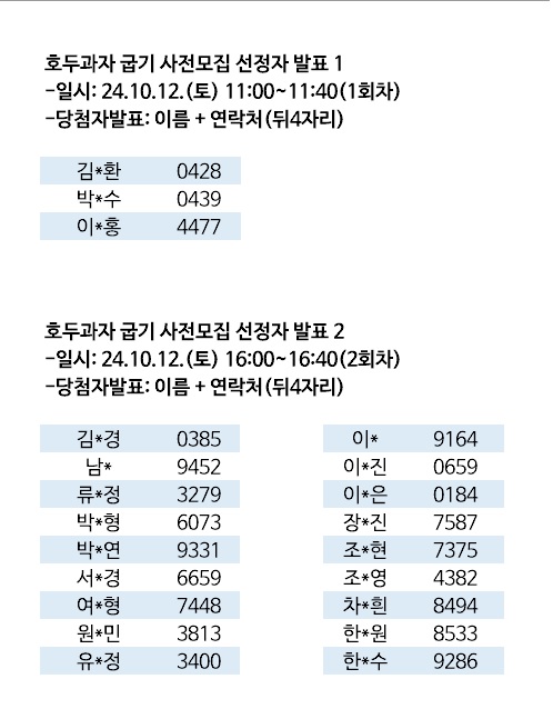 [2024 빵빵데이 천안] 호두과자 굽기 선정자 발표 (ㄱㄴㄷ순)